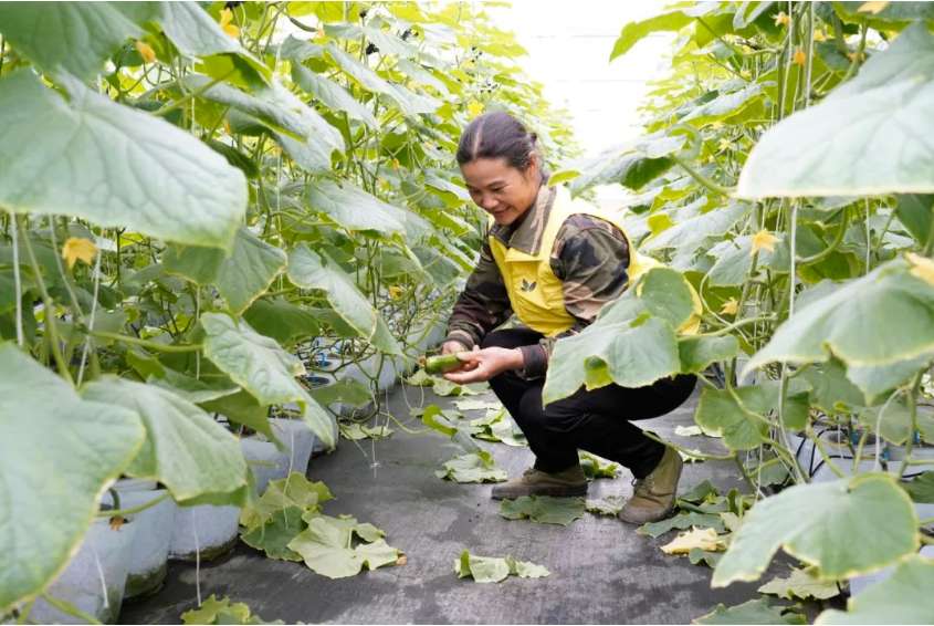 新三智慧农业示范基地里,农民正在采摘青瓜