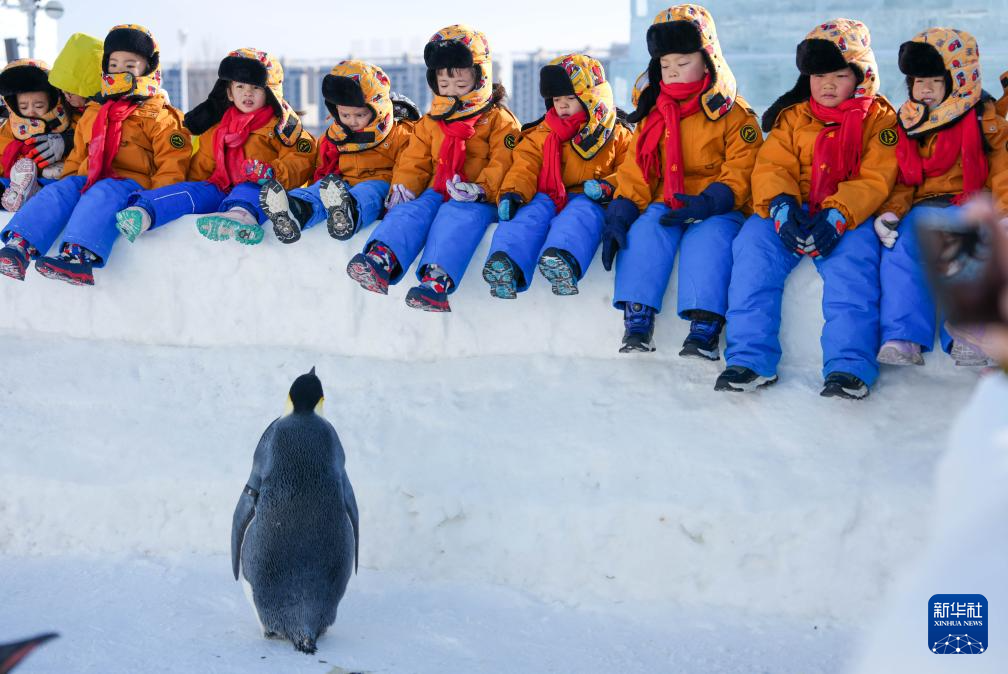 1月14日,广西“小砂糖橘”在位于吉林长春的长春冰雪新天地观看企鹅。