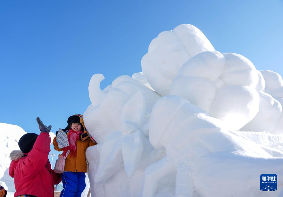1月14日,广西“小砂糖橘”在位于吉林长春的长春冰雪新天地欣赏冰雕。