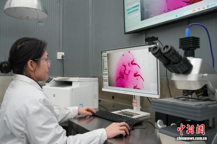 2月9日,广西崇左凭祥市,友谊关口岸海关查验平台工作人员仔细查验来自东盟国家的榴莲,为这些跨越山海的“年货”提供安全保障。友谊关口岸是中国最大的榴莲进口口岸,大批榴莲将通过这里开启在中国的“春运”之旅。图为南宁海关技术中心植物检疫现场实验室(友谊关口岸)工作人员展示榴莲切片上检出的大洋臀纹粉蚧,这批榴莲将在进行消杀程序后方可进入中国市场。中新社记者陈冠言 摄