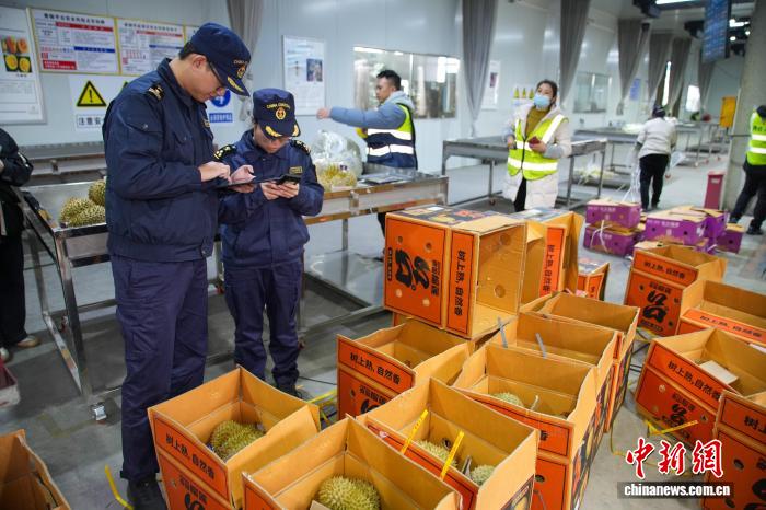 2月9日,广西崇左凭祥市,友谊关口岸海关查验平台工作人员仔细查验来自东盟国家的榴莲,为这些跨越山海的“年货”提供安全保障。友谊关口岸是中国最大的榴莲进口口岸,大批榴莲将通过这里开启在中国的“春运”之旅。中新社记者陈冠言 摄