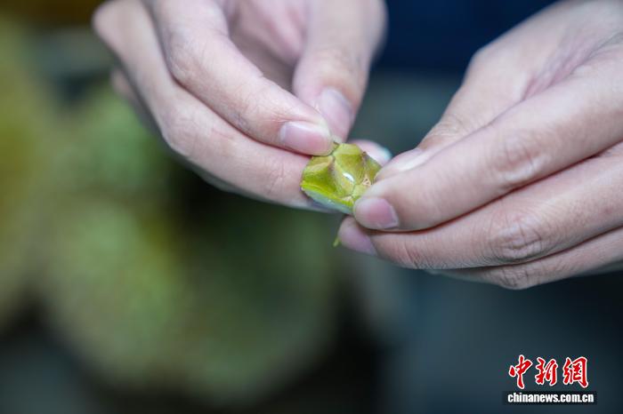 2月9日,广西崇左凭祥市,友谊关口岸海关查验平台工作人员仔细查验来自东盟国家的榴莲,为这些跨越山海的“年货”提供安全保障。友谊关口岸是中国最大的榴莲进口口岸,大批榴莲将通过这里开启在中国的“春运”之旅。图为海关工作人员展示发现活虫的榴莲切片,这批榴莲将在送检后通过一系列消杀程序方可进入中国市场。中新社记者陈冠言 摄