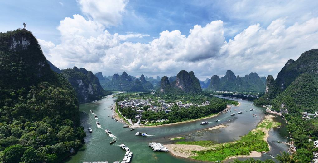 2025年9月13日,在漓江广西桂林市阳朔县兴坪镇段,游人游览漓江两岸风光(无人机全景照片)。新华社发(喻湘泉摄)