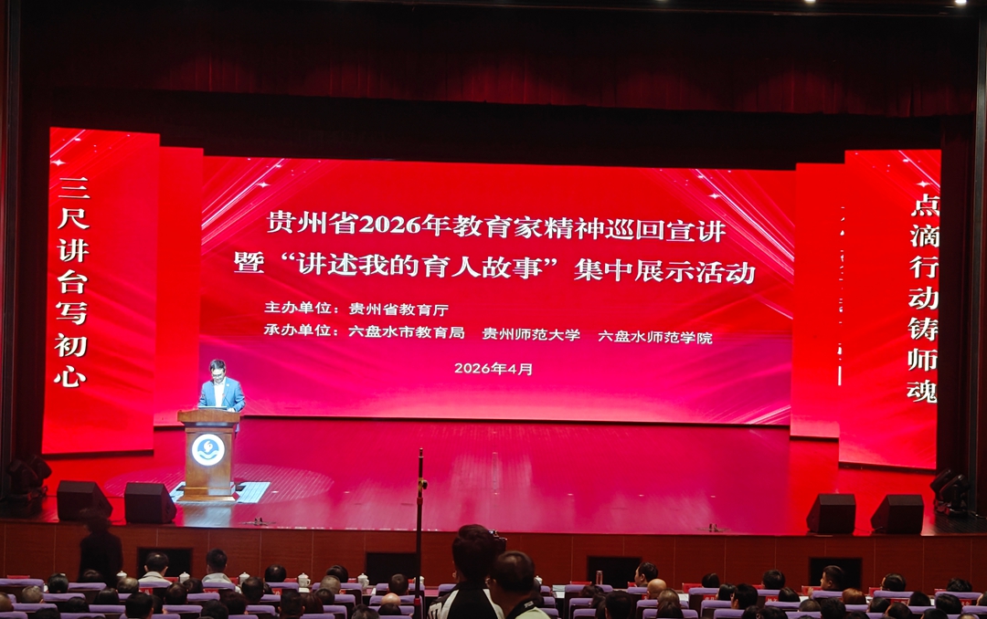 4月17日上午,贵州省2026年教育家精神巡回宣讲暨“讲述我的育人故事”集中展示活动在六盘水师范学院举行。此前4天,由高校学者、职教骨干、中小学名师组成的宣讲团兵分三路,足迹遍及贵阳、遵义、毕节、铜仁、黔东南、黔南、黔西南、安顺、贵安新区及多所高校,完成12场专题宣讲。此番六盘水站,三组巡讲团成功“会师”,向全市教育工作者及师范生代表进行一场跨越学段、直面心灵的深度对话与精神传递。
