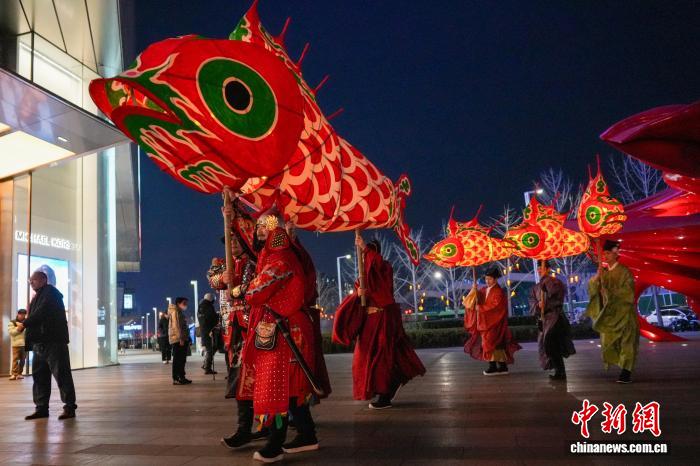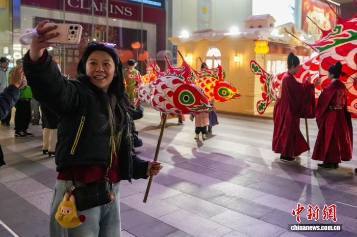 2月8日晚,河南郑州金水区花园路商圈一商场外举行鱼灯巡游表演,吸引众多市民和游客驻足观看、拍照打卡,巡游活动“解锁”商圈年味。图为鱼灯巡游现场。中新社记者范晓恒 摄