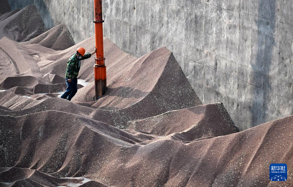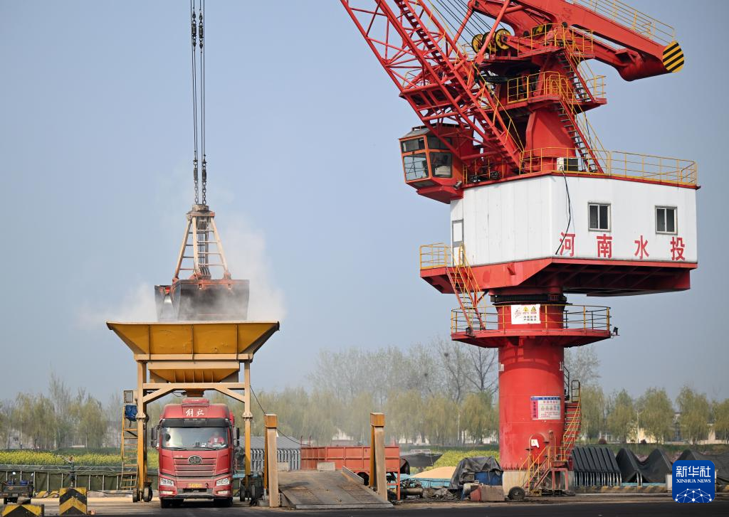 3月31日,码头工人在周口港中心港区范营作业区卸货。