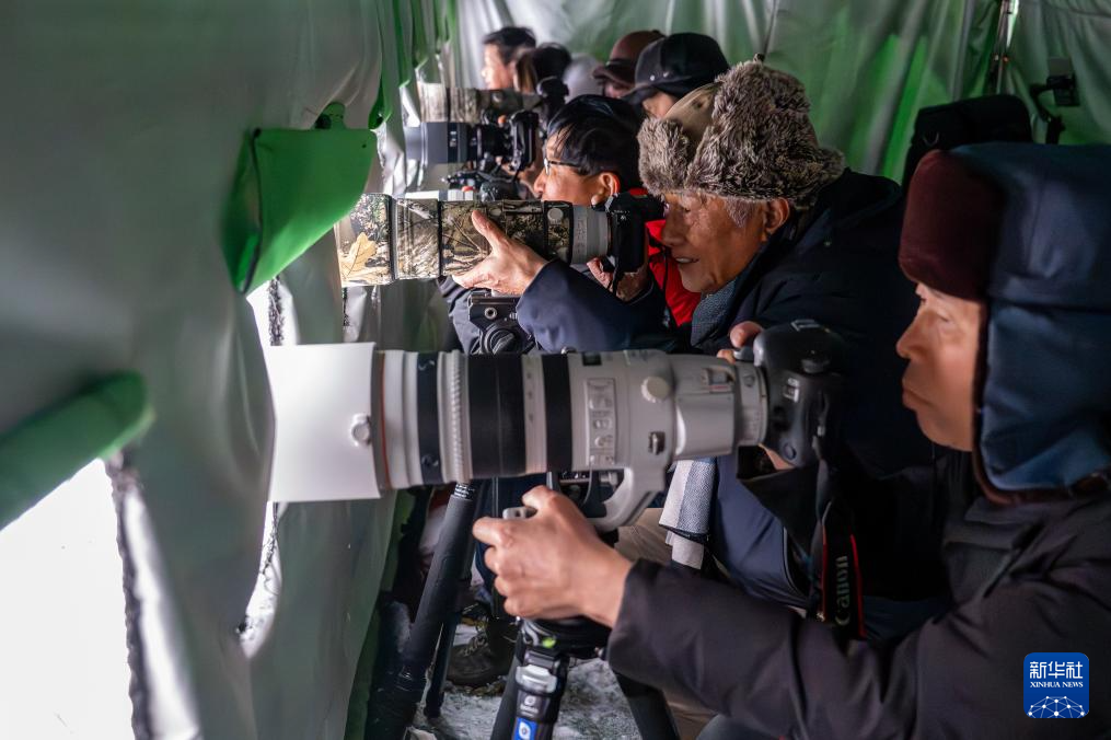 1月20日,在神农架林区红坪镇温水村,观鸟爱好者们在观鸟点位拍鸟。