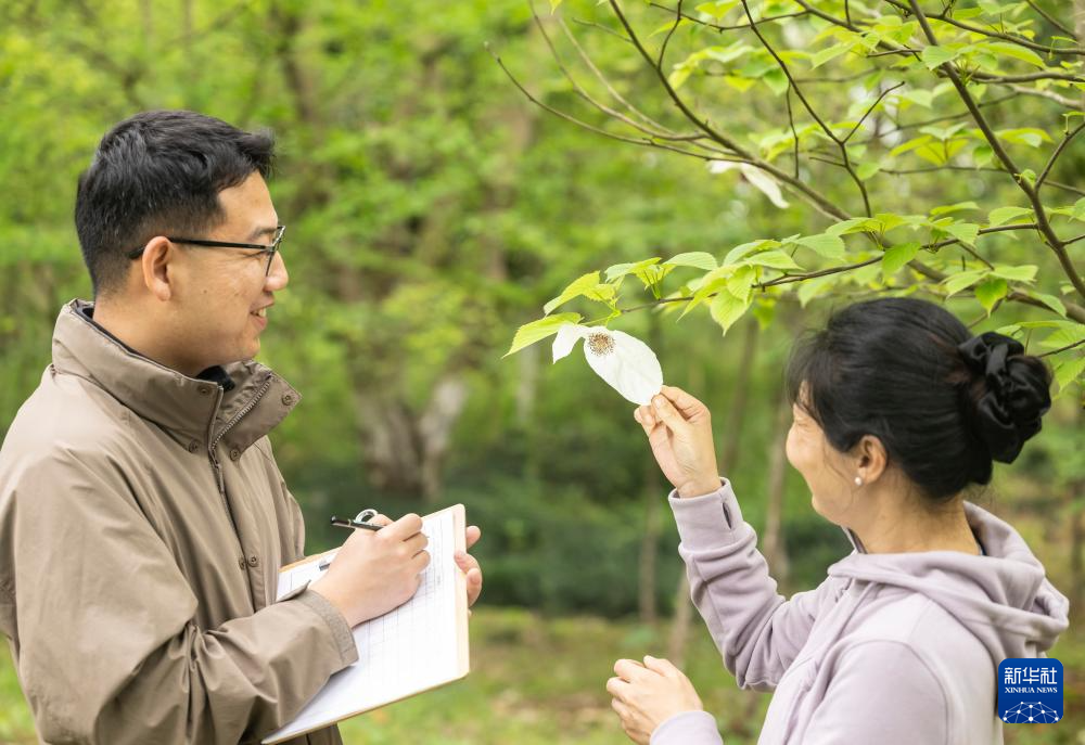 4月13日,三峡集团国家工程中心长江生物多样性研究中心工作人员在湖北宜昌三峡坝区185平台珍稀植物示范区内观察记录珙桐开花情况。