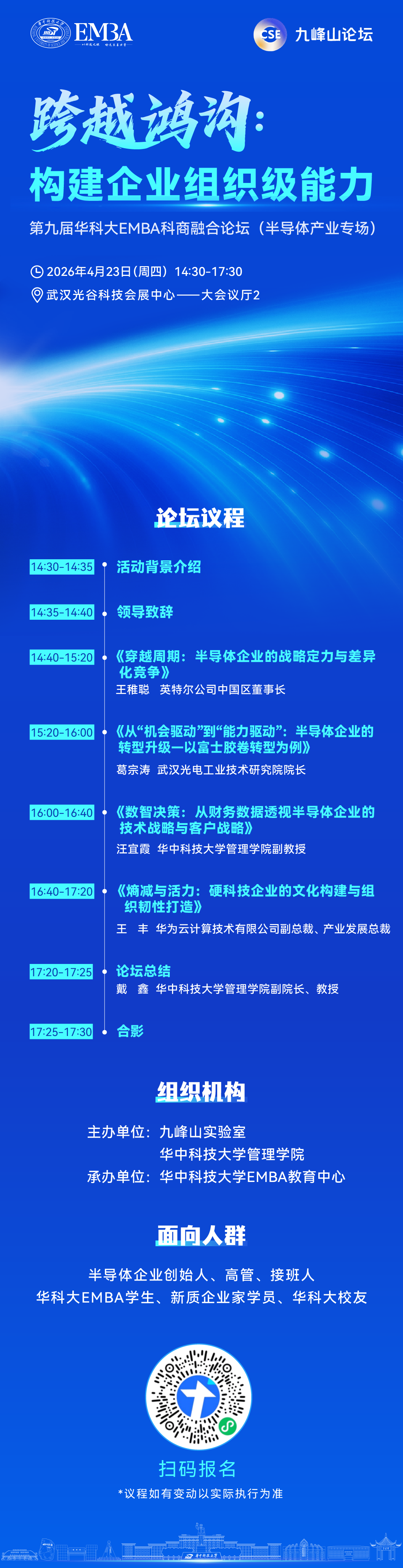 2026年是“十五五”规划开局之年,中国半导体产业正从单点技术突破迈向体系化竞争制胜的关键转型期。华中科技大学EMBA教育中心联合九峰山实验室,聚焦企业管理体系建设,以“跨越鸿沟:构建企业组织级能力”为核心主题,破除 “唯技术论”认知误区,助力半导体企业抓住国产替代战略机遇,坚持业务引领、管理同步升级,推动企业从机会导向向能力导向的深度组织转型。