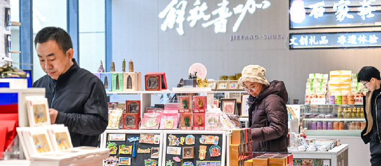 3月8日,市民在河北省石家庄解放纪念馆解放书咖挑选文创产品。