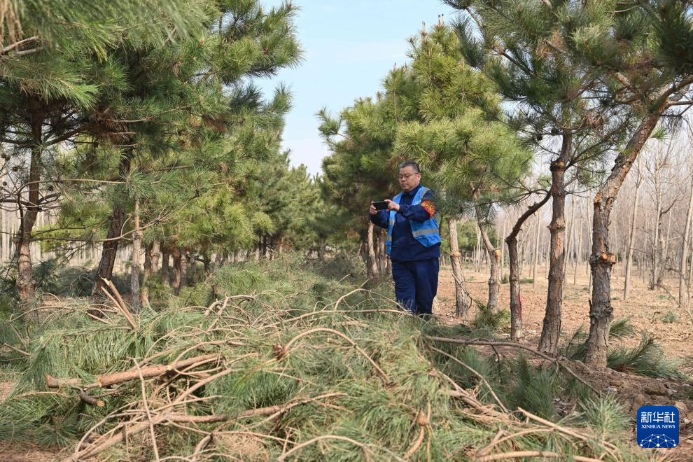 3月19日,刘世光在雄安新区“千年秀林”雄中片区的树林里拍摄巡检现场。