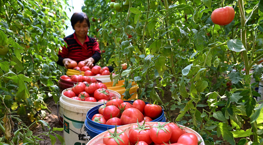 3月31日,在内丘县李田村新兴蔬菜示范田大棚,农民采收直供超市的水果番茄。