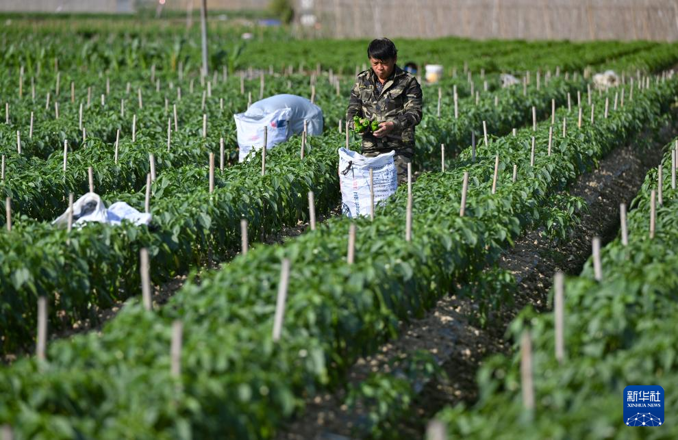 1月8日,农民在海南省澄迈县瑞溪镇金安洋蔬菜种植基地采收辣椒。