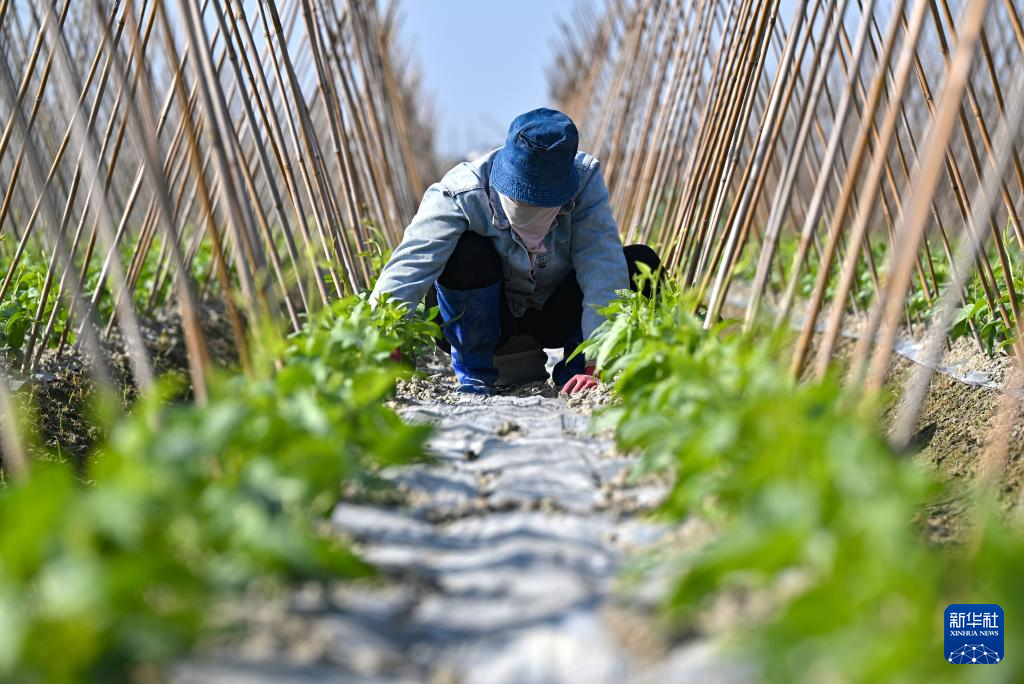 1月8日,农民在海南省澄迈县瑞溪镇罗浮洋蔬菜种植基地管护豇豆苗。