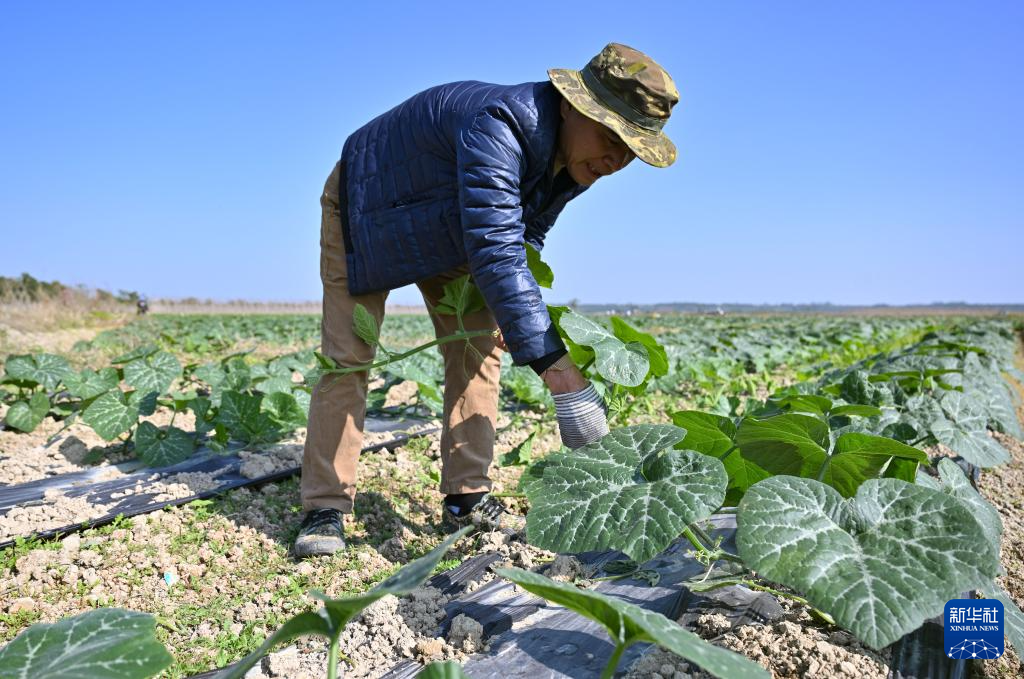 1月8日,农民在海南省澄迈县瑞溪镇罗浮洋蔬菜种植基地对南瓜田进行管护。