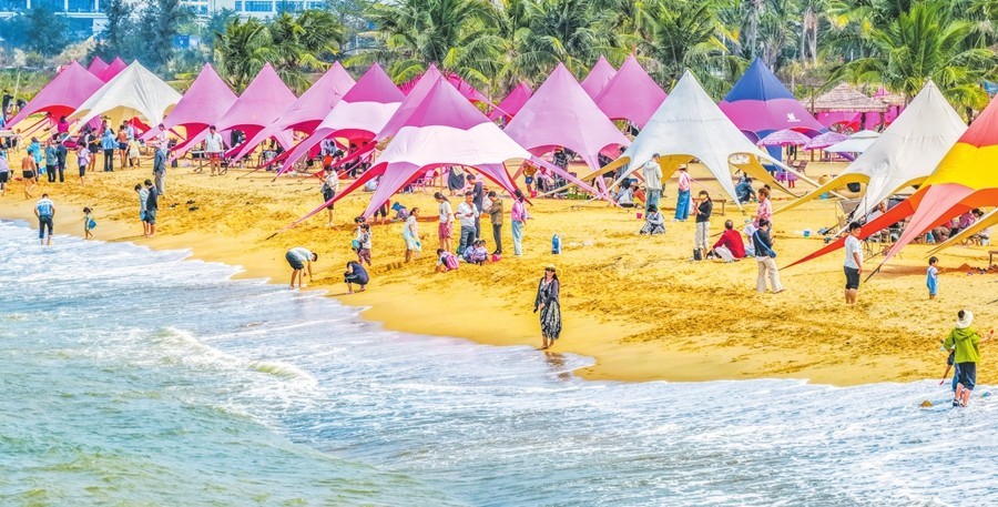 春节假期,海口秀英区西秀镇荣山寮村海岸线,彩色的帐篷点缀沙滩,游客纷至沓来,好一幅热闹的新春图景。 本报记者 康登淋摄