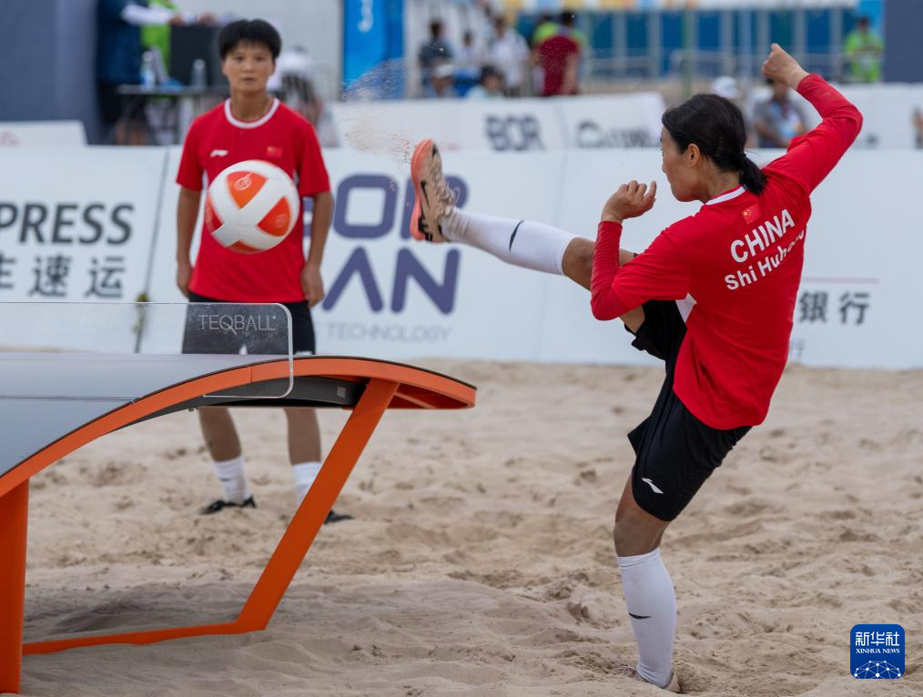 沙地上,一张张弧形球桌格外醒目。中国队选手石胡红、崔亚珍身体微弓,紧盯来球,在攻防转换间完成“绝杀”与救球,引得观众阵阵惊呼。