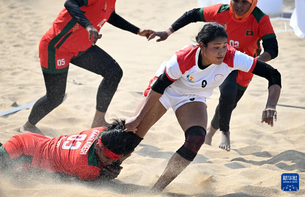 4月26日,孟加拉国队选手布里什蒂·比斯瓦斯(左下)和尼泊尔队选手拉比娜·乔杜里(右)在比赛中。当日,在海南三亚举行的第六届亚洲沙滩运动会沙滩卡巴迪女子小组赛中,尼泊尔队38:36战胜孟加拉国队。新华社记者赵子硕 摄