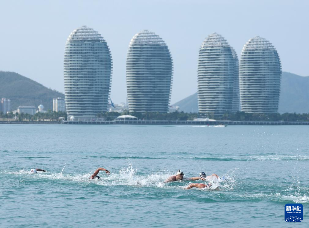 4月26日,选手们在公开水域游泳男子5公里比赛中。新华社发(马子涵摄)