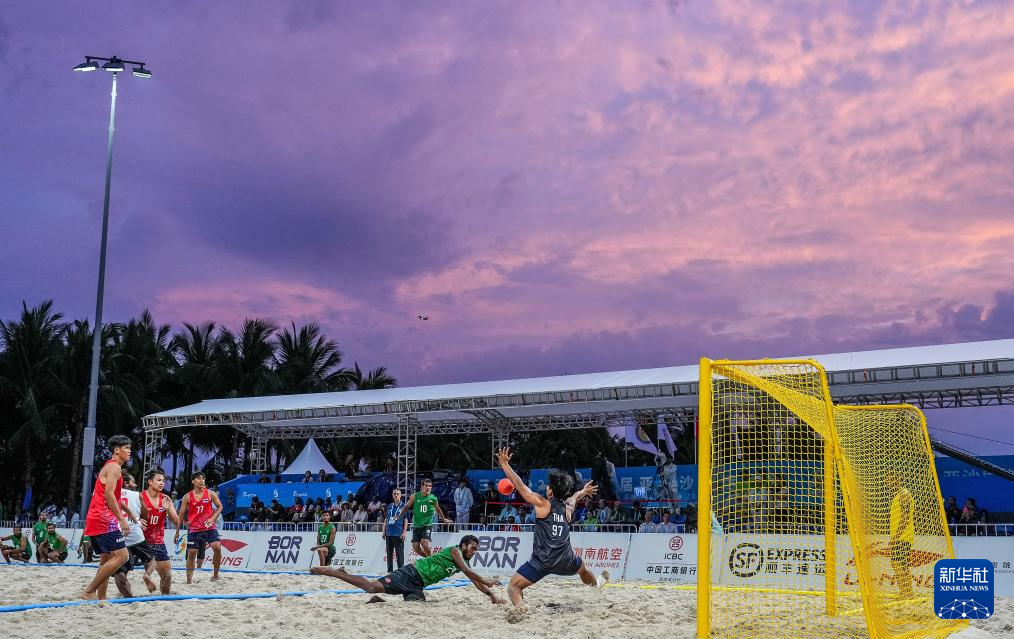 4月24日,在海南三亚举行的第六届亚洲沙滩运动会沙滩手球男子小组赛中,泰国队2:0战胜马尔代夫队。新华社记者 李博摄