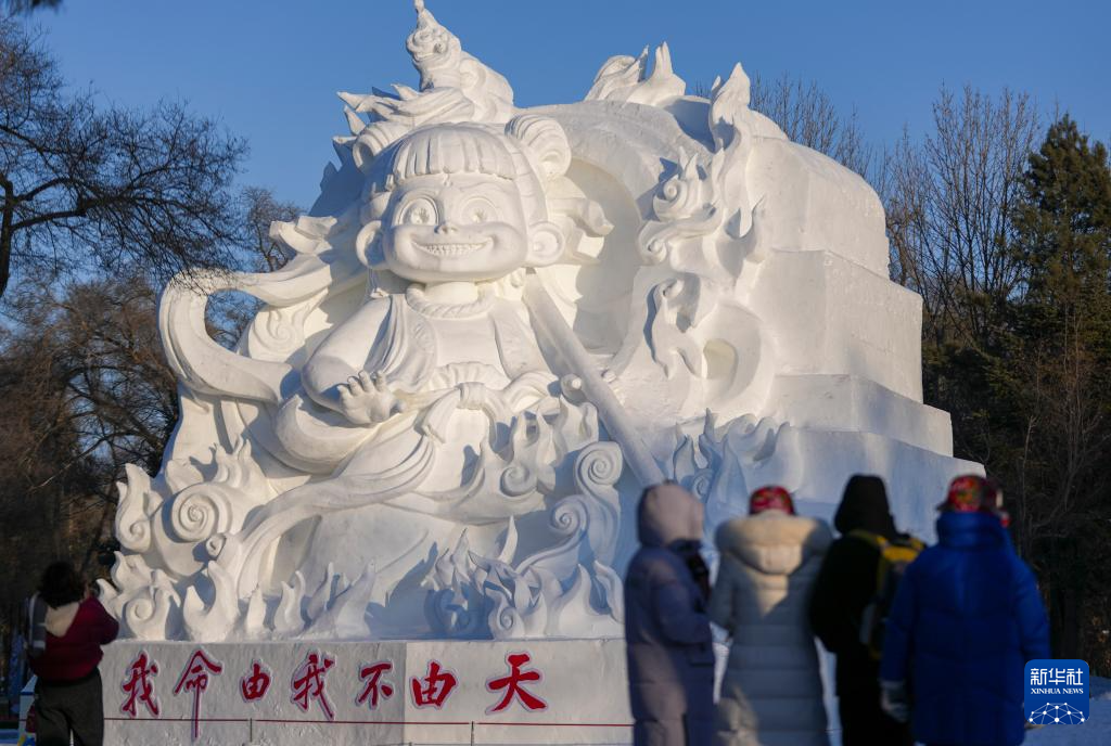 1月7日,游客在太阳岛雪博会哪吒雪雕前留影。