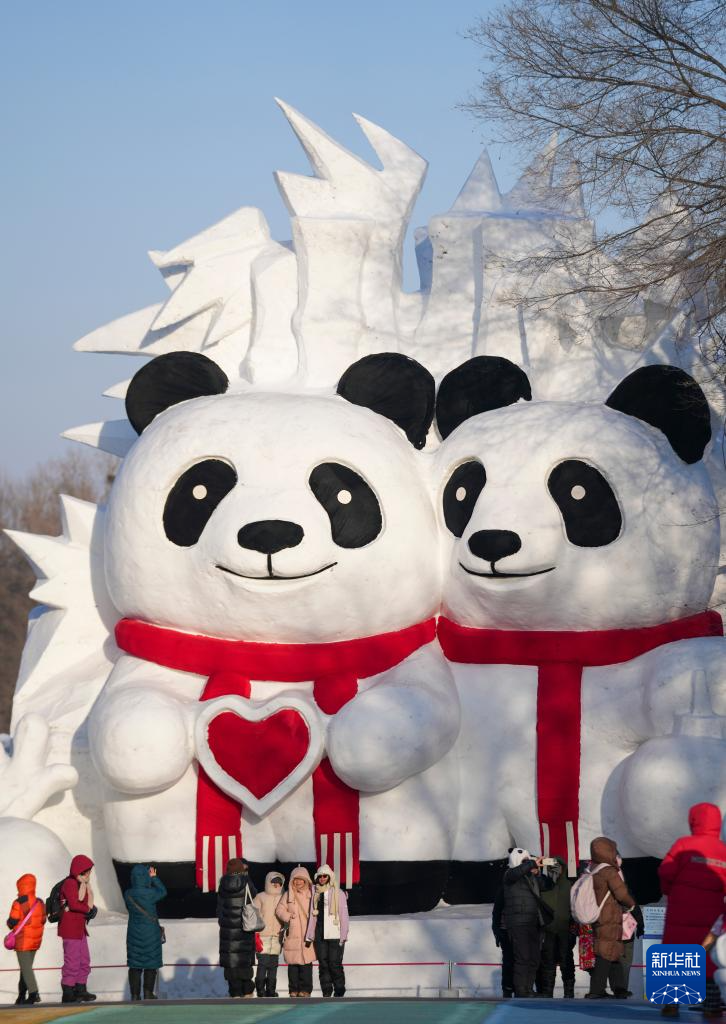1月8日,游客在太阳岛雪博会巨型大熊猫雪雕前留影。