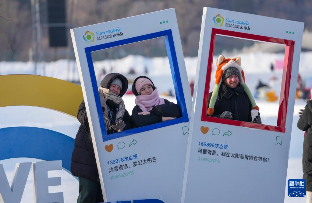 1月8日,外国游客在太阳岛雪博会园区游玩拍照。