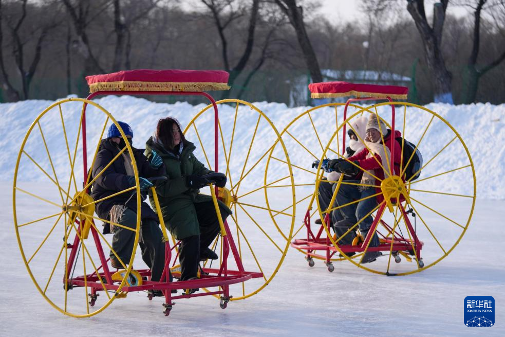 1月8日,外国游客在太阳岛雪博会园区体验冰上自行车。