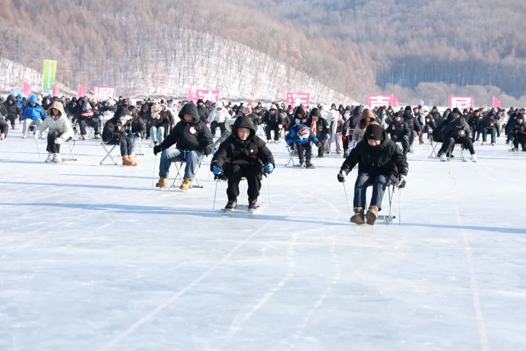 开幕仪式前,1050位挑战者按编号有序进入挑战场地,在指定区域与标有对应号码的冰车一一匹配。挑战者准备就绪后,开幕仪式启动,吉尼斯世界纪录认证官侯颖宣读了挑战规则。规则要求,所有挑战者须在挑战开始信号发出后,以自身力量推动冰车滑行至少1分钟,且全程在指定区域内滑行。鸣笛声后,挑战者们坐在冰车上同步发力,冰钎触冰,推动冰车稳稳滑行,场面蔚为壮观。挑战过程中,无人机从空中航拍,地面多机位跟录,全程无死角记录这激动人心的时刻,还有20名监督员分区记录,2名独立见证人严格核验,确保世界纪录挑战的公正与权威。