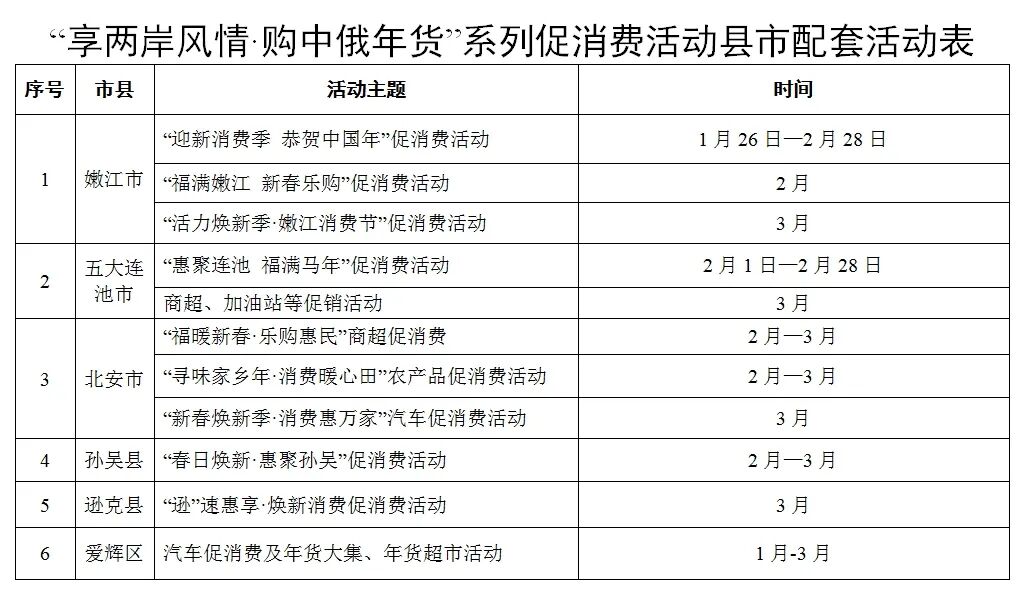 随着春节脚步的临近,街头巷尾年味渐浓,囤年货、赏民俗、打卡游玩也都提上了日程!为了让市民游客过一个热闹喜庆、实惠满满的新春佳节,黑河市将于2026年2月至3月期间,重磅启幕“享两岸风情·购中俄年货”暨“购在中国”乐购新春系列主题促消费活动,打造线上线下联动的“1+4+N”促消费矩阵,一站式体验年货采购与特色文化盛宴,承包你整个新春的欢乐与实惠~