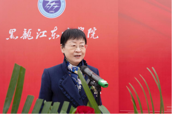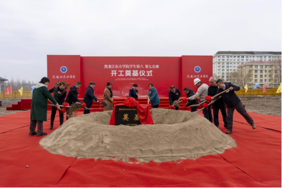 黑龙江东方学院校长徐梅宣布项目正式开工,与会领导嘉宾共同为项目奠基培土。