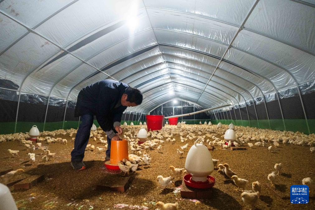 4月15日,在古岳峰镇岳峰村育苗中心,合作社工作人员在给小鸡喂食。
