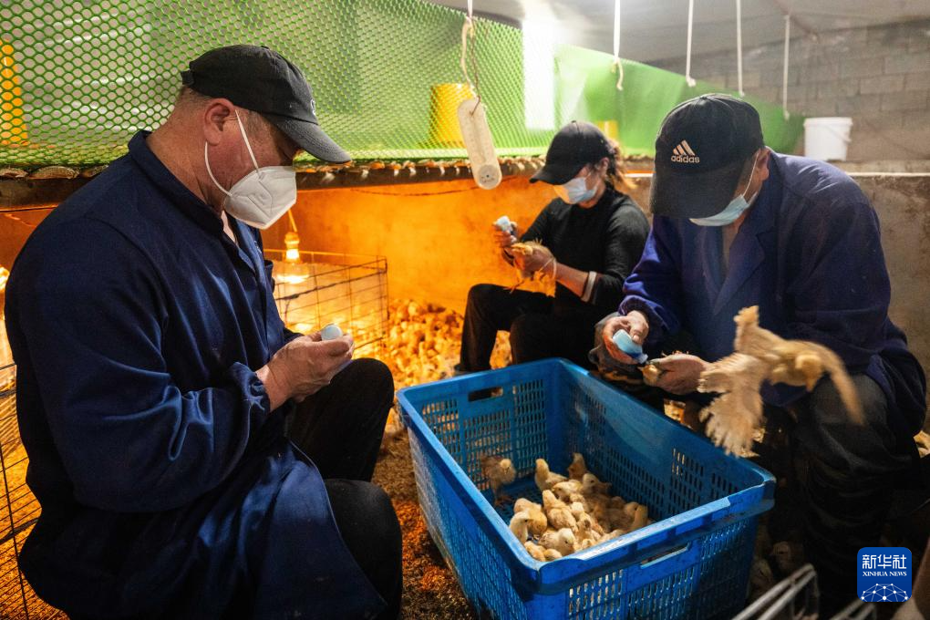4月15日,在古岳峰镇岳峰村育苗中心,合作社工作人员在给小鸡接种疫苗。