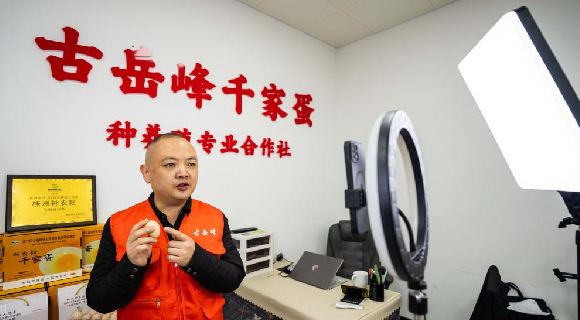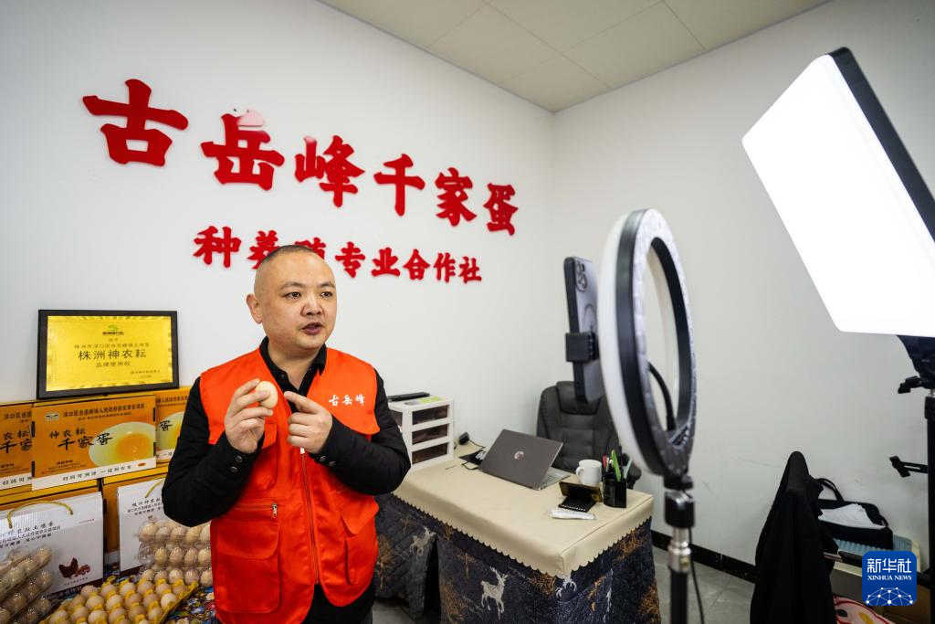 4月15日,在位于古岳峰镇的株洲千家蛋种养殖专业合作社,工作人员通过直播推荐鸡蛋。