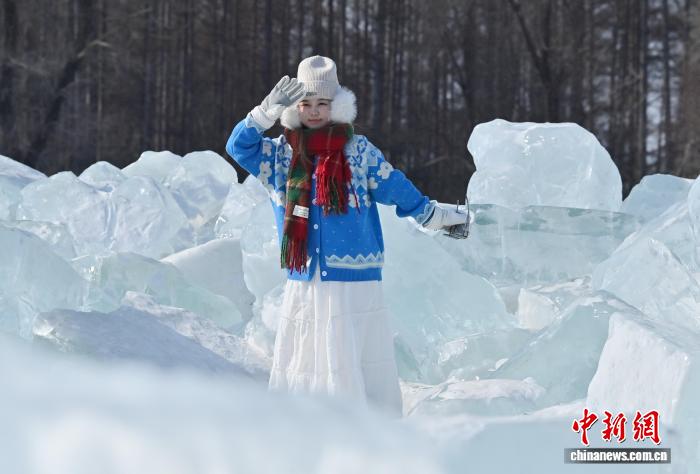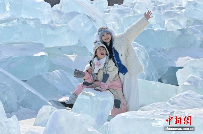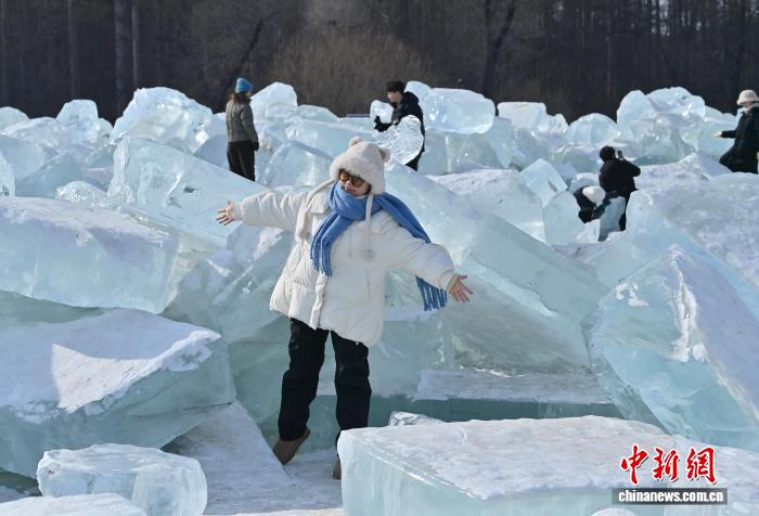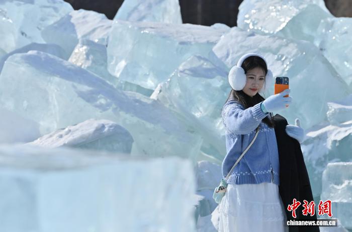 2月9日,在长春净月潭国家森林公园内,由水库天然冰块堆砌而成的“蓝冰”景观,吸引市民打卡拍照。“蓝冰”是指致密坚硬的冰,因冰内部空气被挤掉而变得晶莹透彻,这时阳光中波长较短的蓝光被致密坚厚的冰层散射,冰块便呈现出水晶般美丽的蓝色。中新社记者张瑶 摄