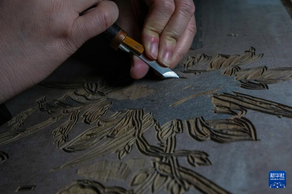 乔兰蓉在工作室里雕版(2月5日摄)。
