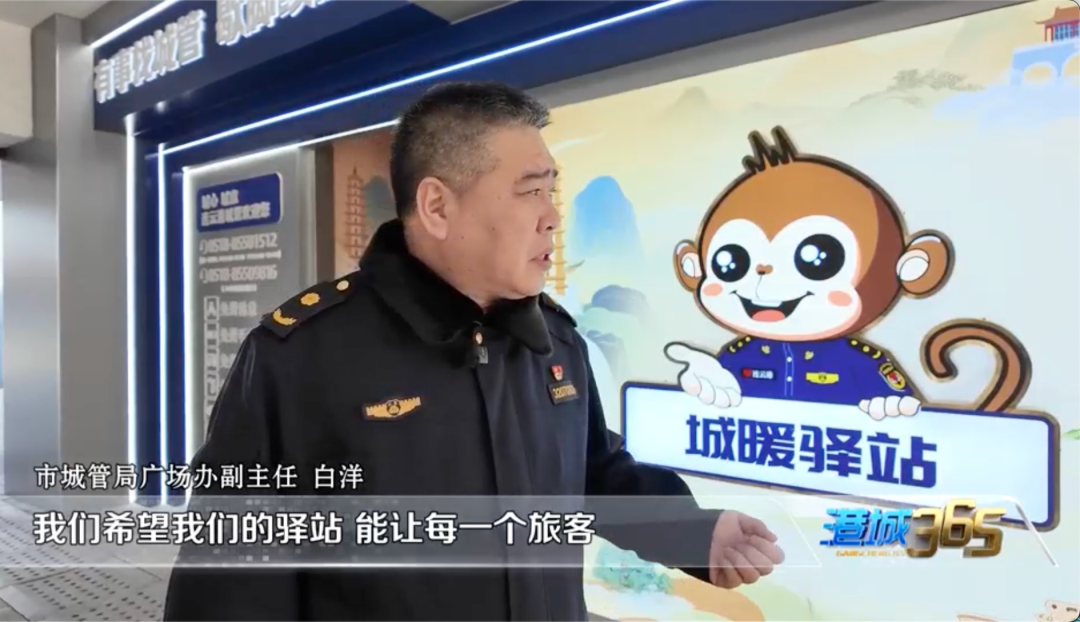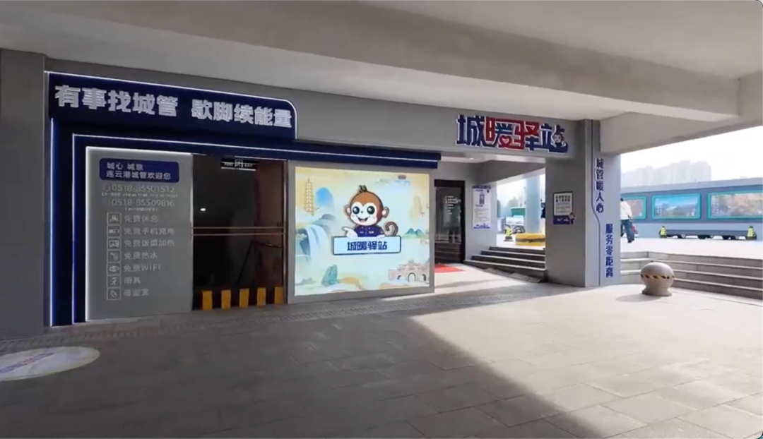 在江苏省连云港高铁站西侧入口处,焕然一新的“城暖驿站”让人眼前一亮。门口“有事找城管歇脚续能量”的标识格外醒目,融入港城文旅特色的卡通形象“La分猴”显得亲切可爱。展示墙上清晰公示了24小时服务电话,并明确列出驿站的服务功能。