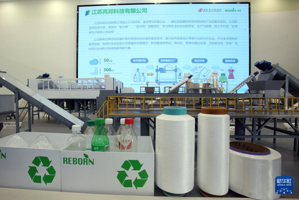 这是在芮邦科技有限公司拍摄的展板,展示塑料瓶制成再生涤纶长丝,再制成衣服的过程(2026年3月26日摄)。成立于2020年的芮邦科技有限公司位于江苏省宿迁市泗阳县,专注再生涤纶长丝的研发、生产与销售。公司拥有世界领先的循环再利用涤纶长丝熔体直纺技术,是行业内率先践行零碳行动的化纤企业。
