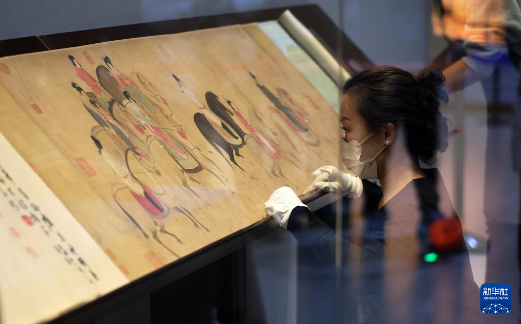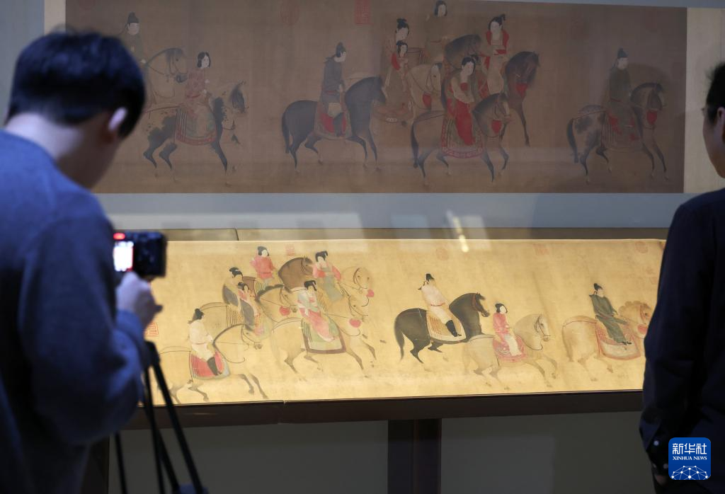 12月29日,媒体记者在辽宁省博物馆拍摄宋摹张萱《虢国夫人游春图》。