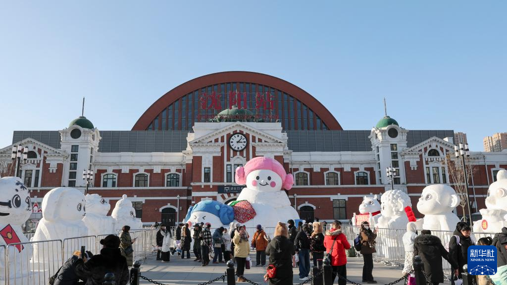 1月22日,在沈阳火车站东广场,雪人“迎接”旅客。