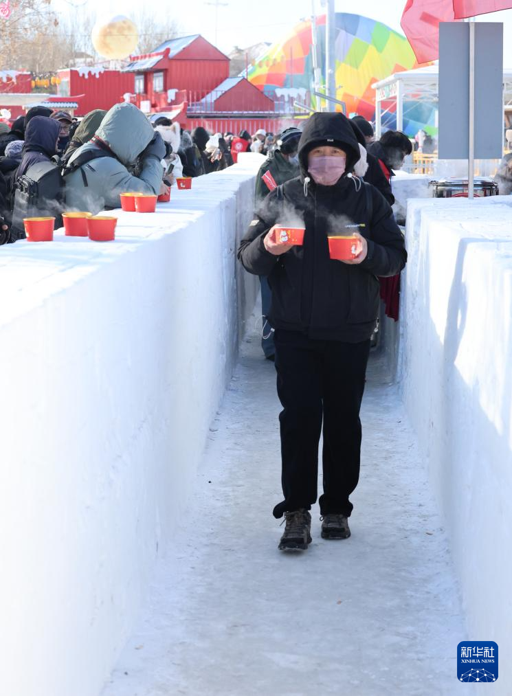 1月24日,在2026第十一届沈阳卧龙湖冬捕季活动现场,游客领取鱼汤和姜茶。