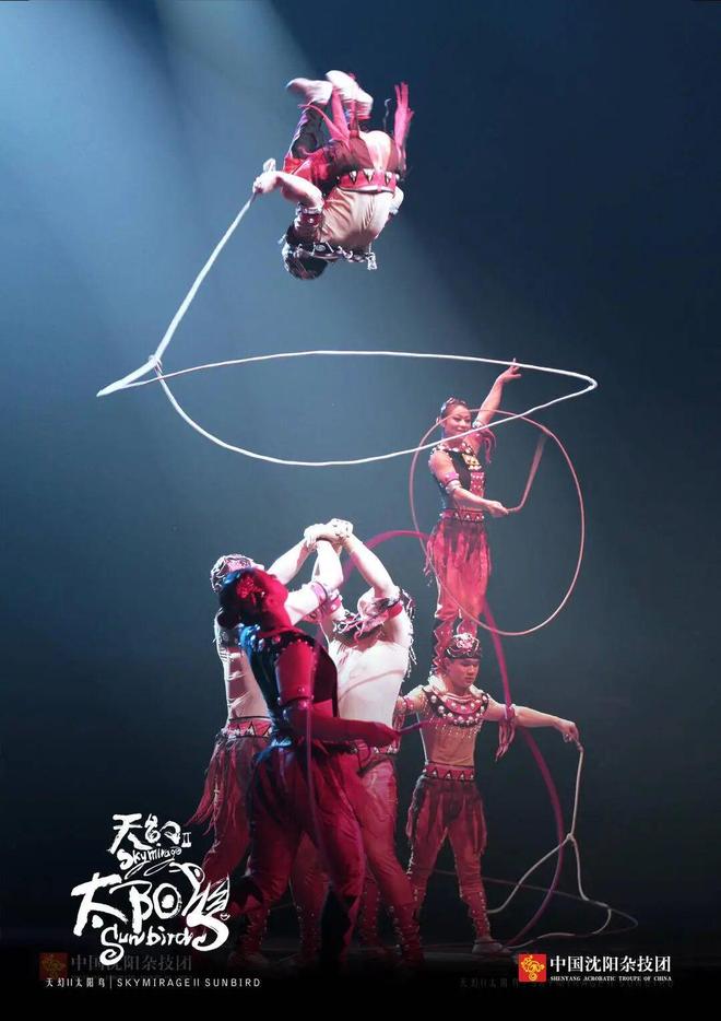 如果说《天幻》系列实现了杂技从“炫技”到“艺术”的跨越,那么《熊猫——寻梦之旅》《太阳鸟》则标志着沈阳杂技在“戏剧化”“角色化”道路上迈出了关键一步。《太阳鸟》以沈阳新乐遗址出土的距今7200多年的木雕太阳鸟为原型,讲述了一只勇敢无畏的凤凰鸟寻找光明、寻找爱的故事。这部作品做足了中国元素和故事性,为后来《先声》的出现打下了基础。