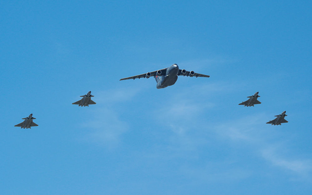 4月22日,接迎第十三批在韩中国人民志愿军烈士遗骸回国的空军运-20B飞抵沈阳,4架歼-20战机护航。新华社记者 李钢摄