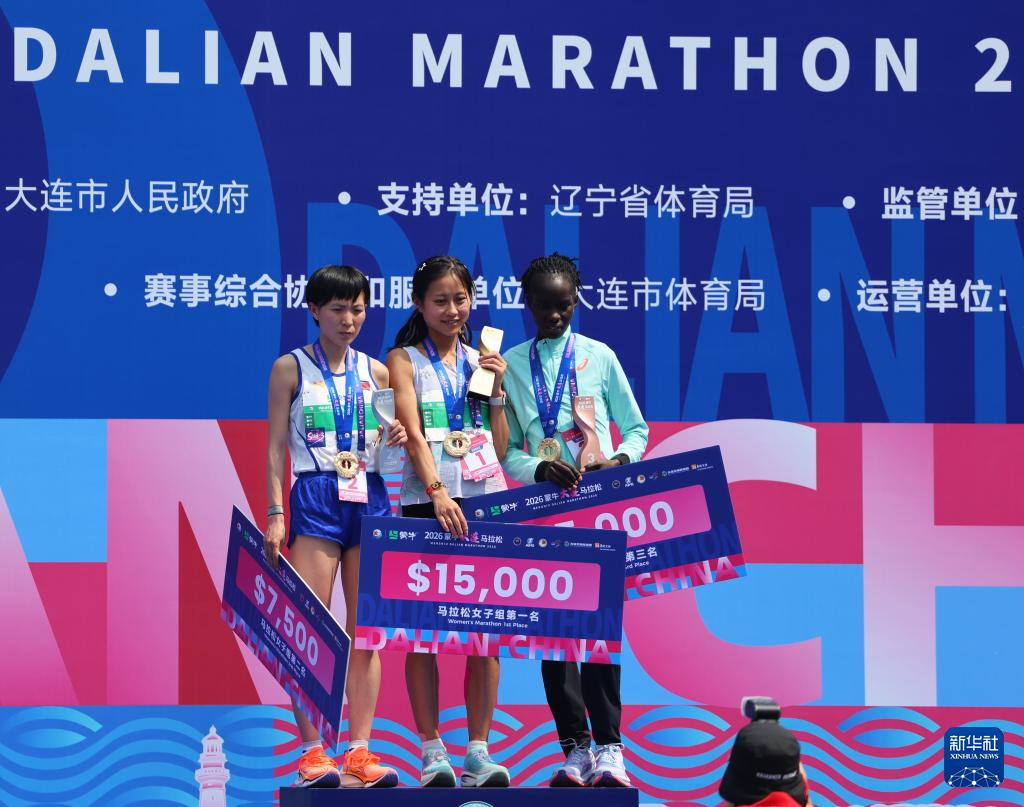4月26日,女子马拉松冠军中国选手朱卿(中)、亚军朝鲜选手李光玉(左)和季军肯尼亚选手萨穆姆在颁奖仪式上。