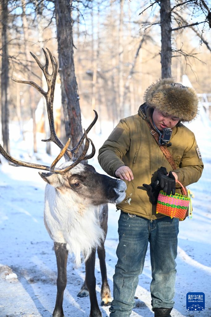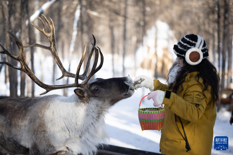 1月15日,游客在根河市敖鲁古雅鄂温克民族乡敖鲁古雅使鹿部落景区与驯鹿互动。