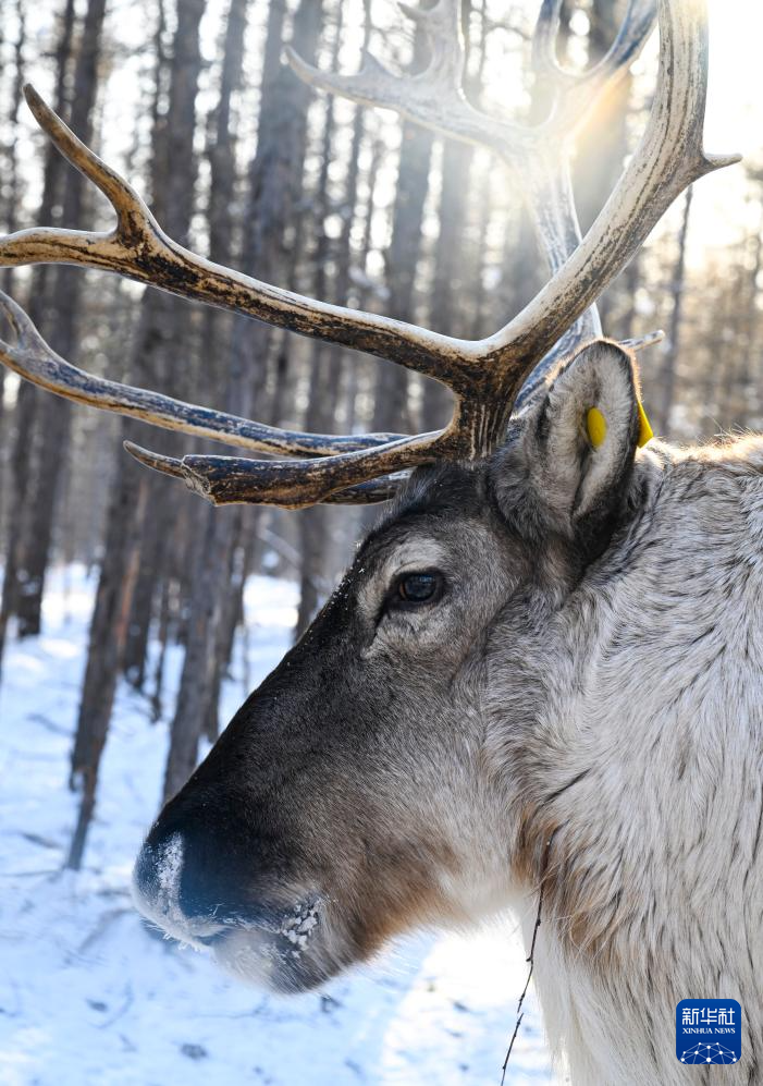 这是1月15日在根河市敖鲁古雅鄂温克民族乡敖鲁古雅使鹿部落景区拍摄的驯鹿。