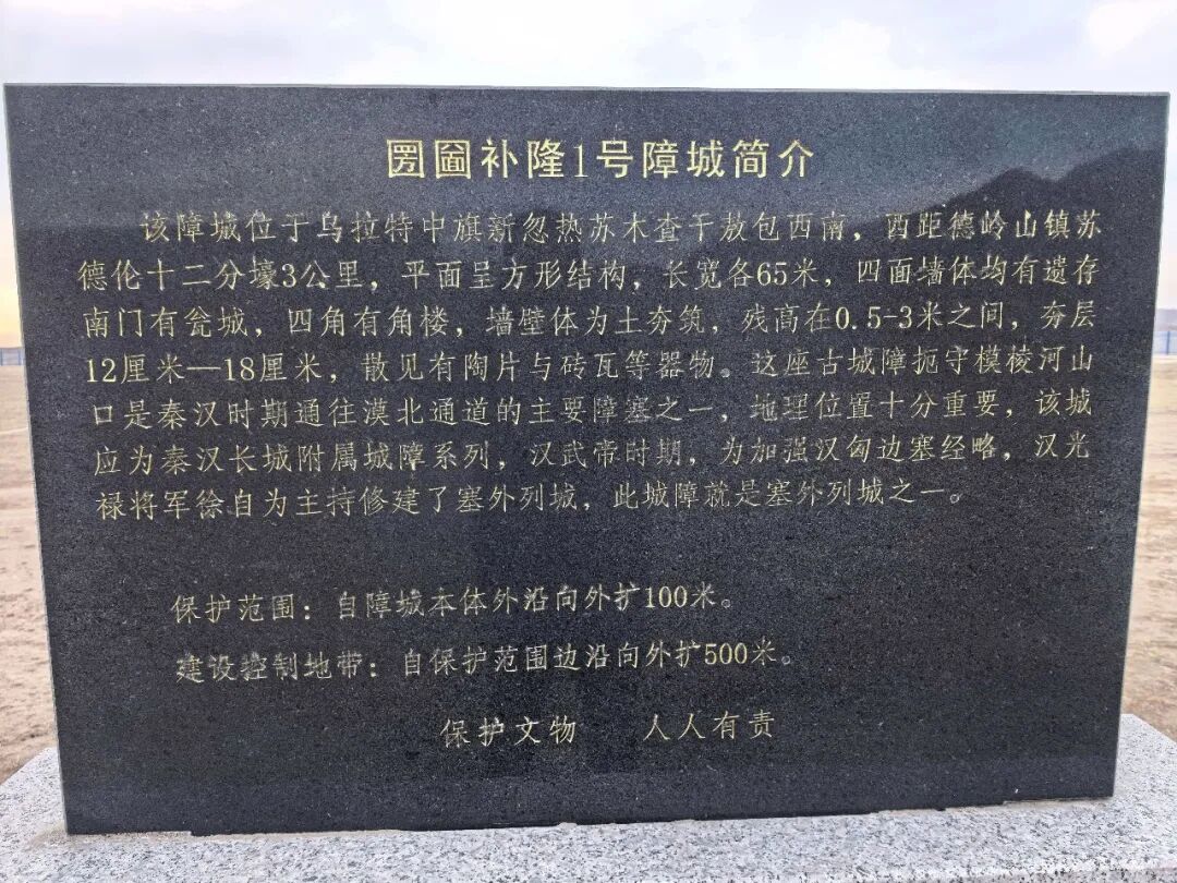 顺流而下,抵达摩棱河山口,在阴山山脉查石太山山口的台地上,有一座古城,叫圐圙补隆一号障城,当地人称为城圪台。古城址位于乌拉特前旗乡苏独仑镇圐圙补隆村东北约15公里。城址平面呈方形结构,长宽各65米,四面墙体均有遗存,南门有瓮城,四角有角楼,墙壁体为土夯筑,残高在0.5—3米之间,夯层12—18厘米,散见有陶片与砖瓦等器物。这座古城障扼守摩棱河山口,是秦汉时期通往漠北通道的主要障塞之一,地理位置十分重要。根据型制及采集器物推断,该城应为秦汉长城附属城障系列。2008年至2010年长城资源调查队对其进行了详细调查,经国家文物局认定其为国家级重点文物保护单位—— 秦汉长城圐圙补隆一号障城。