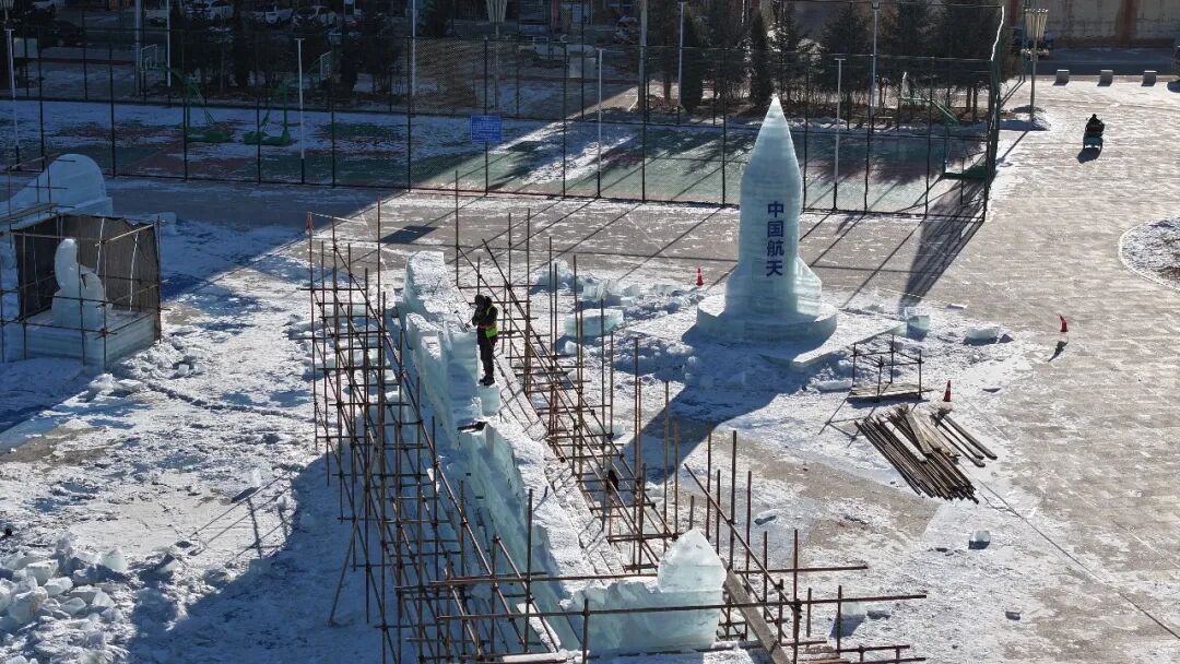 图为冰雕搭建工作正在进行。