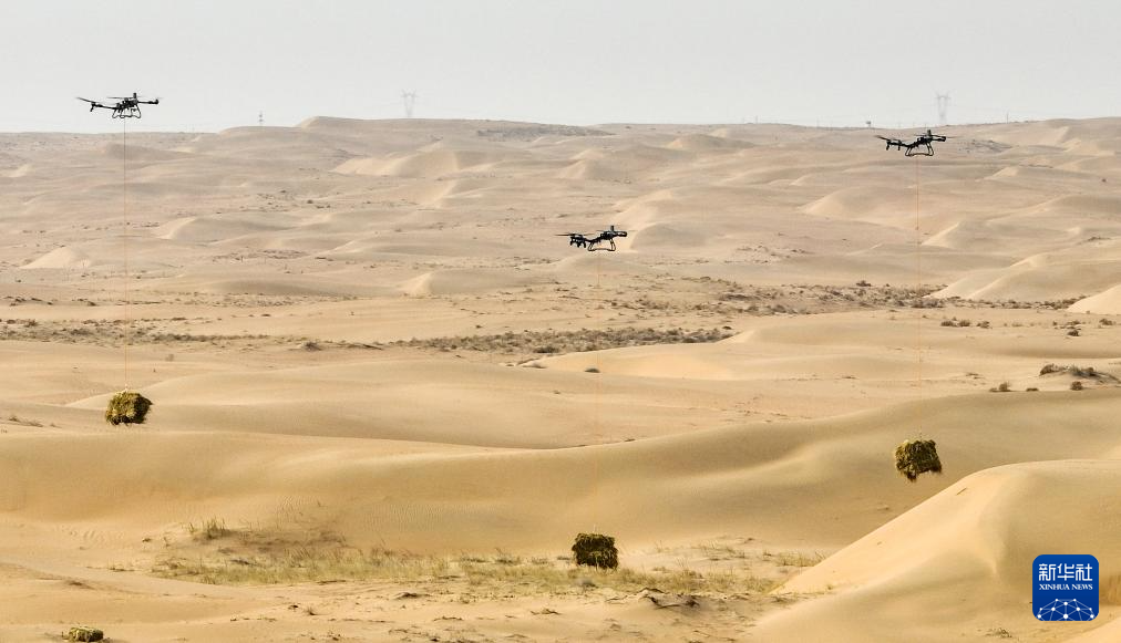 2月28日,无人机在内蒙古阿拉善盟境内的乌兰布和沙漠运送草料(无人机照片)。