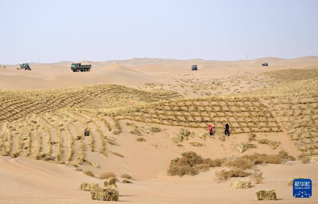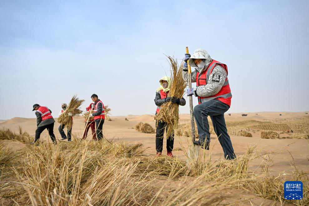 2月28日,工人在内蒙古阿拉善盟境内的乌兰布和沙漠铺设草方格。